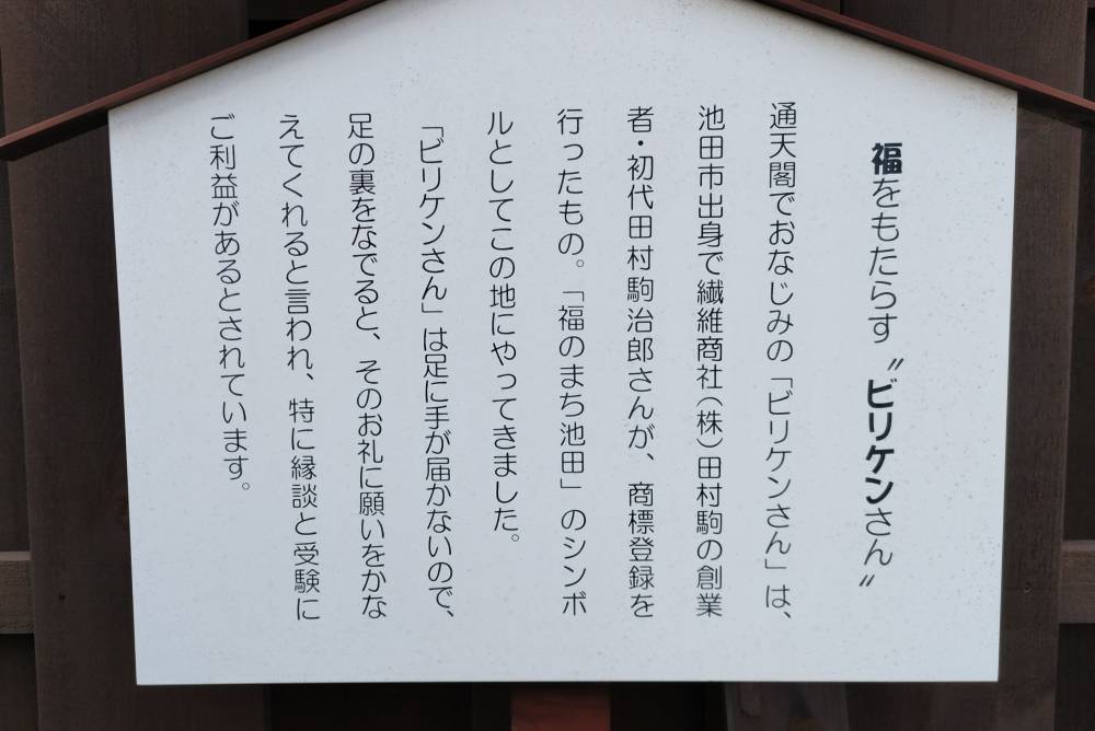 「ビリケン」さんはアメリカの「福の神」なんですが、田村駒治郎氏が商標登録して「通天閣」に祭られたことから有名になりました。田村駒治郎氏が池田の出身ということから、ここに設置されているそうです。