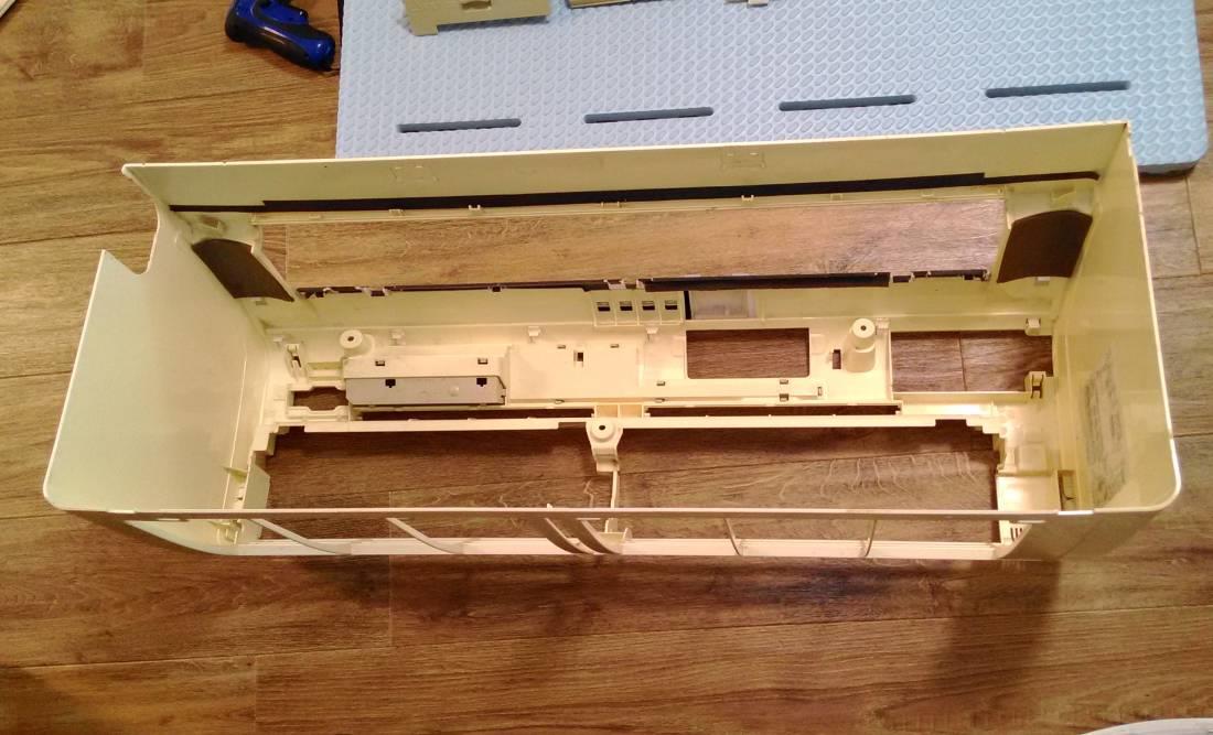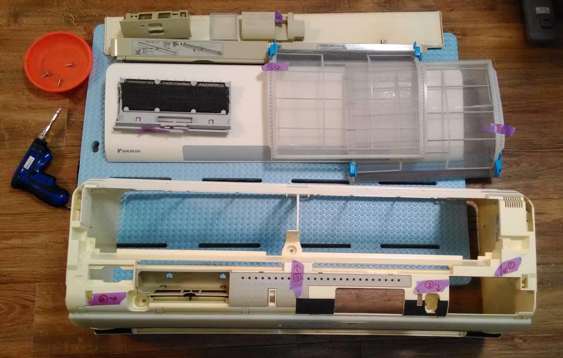 吹出しグリル風向板、エアフィルター、吸気フィルター、脱臭フィルター、ダストボックス、放電ユニットなど、外せるものは全部外しました。