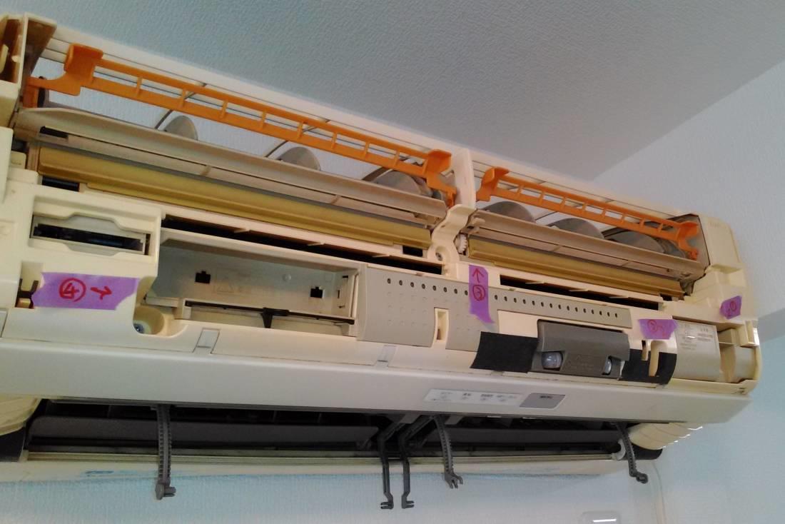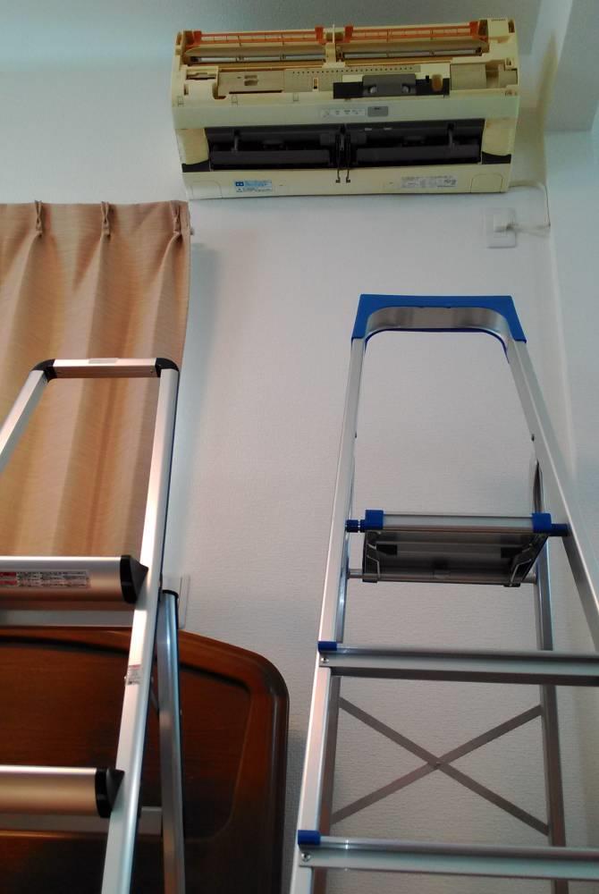 脚立を2脚用意して、いよいよエアコンの分解作業開始。