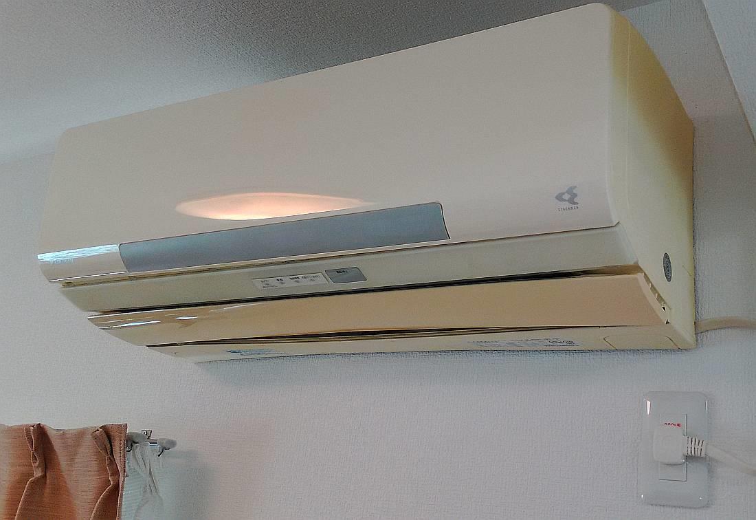 うちの寝室に設置してあるこのエアコン。岐阜の自宅リビングルームで使用していたものを、5年前に川西市へ移設したものです。