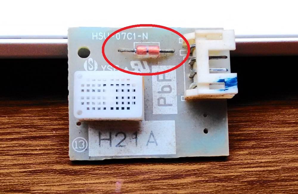 観察すると、赤いサーミスタ部品が基盤に組付けられているようです。つまりこの基盤は『湿度センサー』というパーツ名になっていますが、実は『室温センサー』も兼ねているようです。