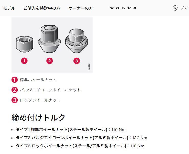 このナットは「バルジエイコーンホイールナット」と呼ばれるそうですが、VOLVOの公式サイトを参照したら、普通のボルトの締付トルクが「110 Nm」なのに対して、このバルジエイコーンホイールナットは「130 Nm」だそうです