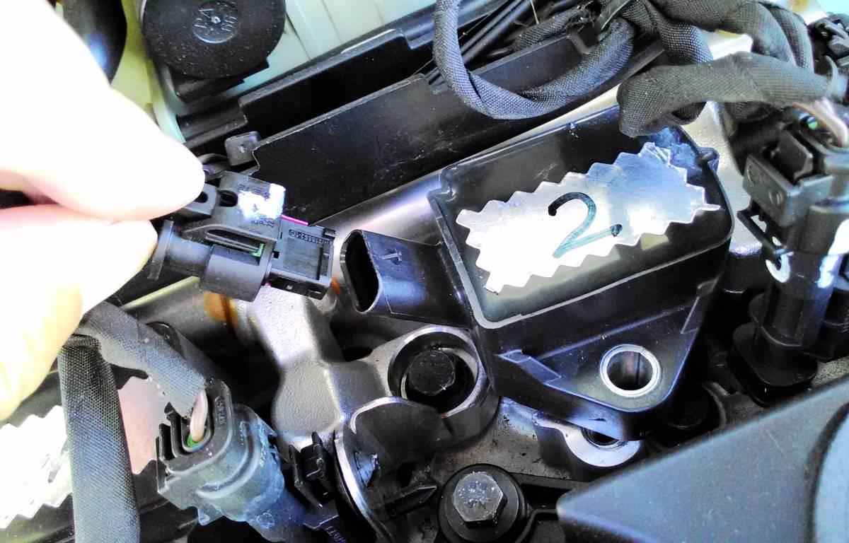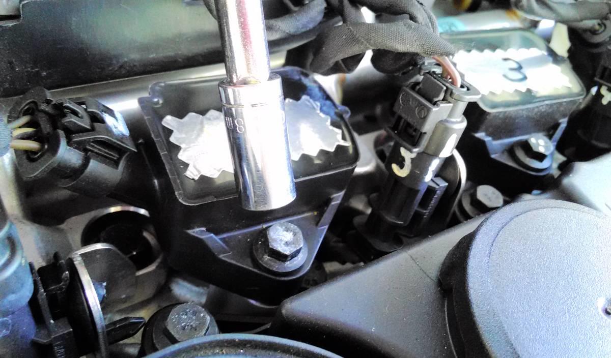 試しに作業し易そうな2番のプラグを外すことしました。コイルのボルト(8mm)は振動で緩まないよう、けっこう固く締まっていたので、取付け時はこの感覚を忘れないようにします。