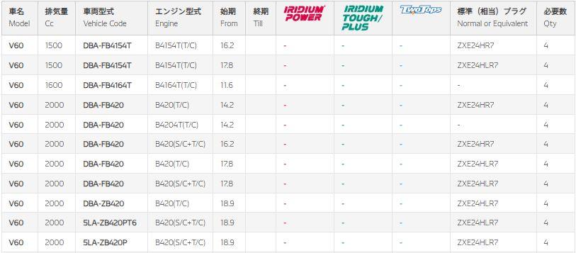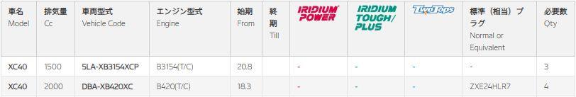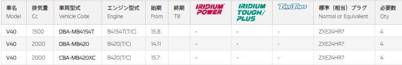 うちのV40(「T3」グレード(型式:DBA-MB4154T)。1.5L ガソリンターボ(エンジン型式:B4154T))は、プラグの適合情報が少なくて困りましたが、取り外したプラグは、型番「ZXE24HLR7」で純正番号「31491673」でした。
