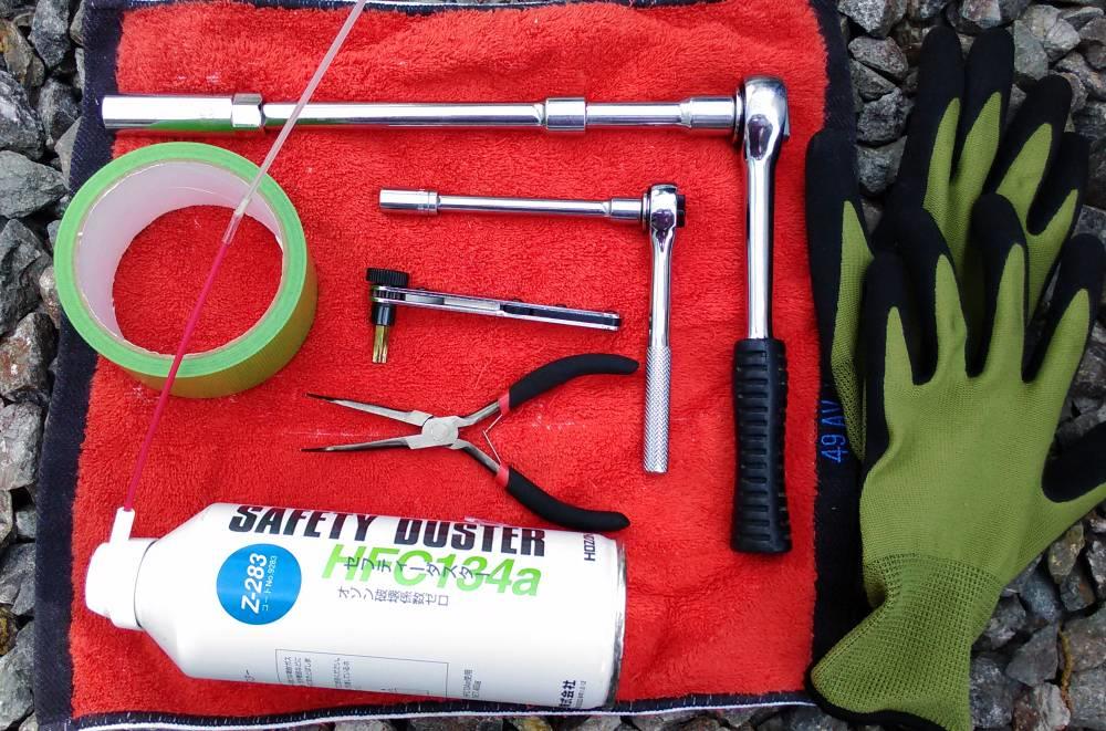 エアダスターは、ノズルを延長してプラグホール内の煤を吹き飛ばすのに使いました。(笑) 養生テープは、取外したコネクタを固定しておくためのものです。