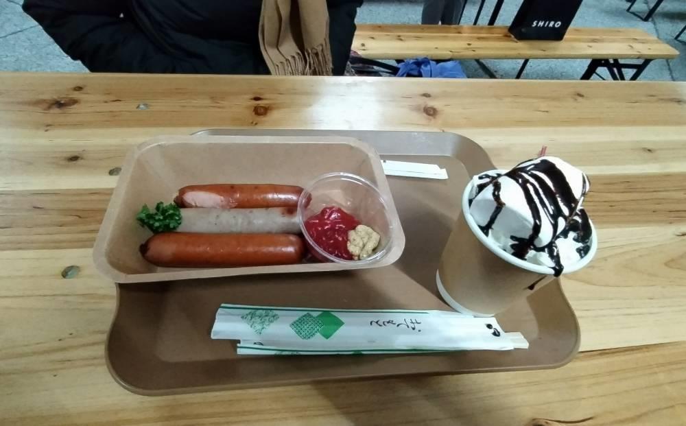 キッチンカーでソーセージとホットココアを購入して小腹を満たしました。